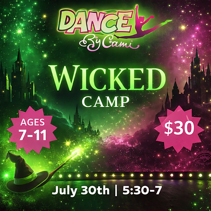 Step into the magical world of Oz at our Wicked-Themed Dance Camp! Dancers will defy gravity as they learn a fun, high-energy routine inspired by the music and characters of Wicked. Throughout the camp, students will explore movement, creativity, and storytelling while bringing the spirit of the Emerald City to life.